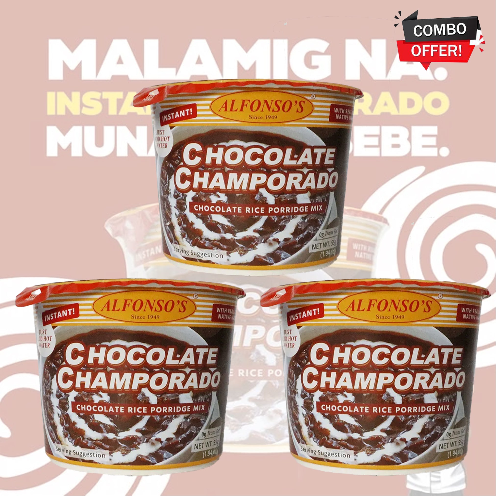 Satisfy your chocolate cravings the traditional way with Alfonso’s Chocolate Champorado 55g × 3 Combo Pack — delicious, convenient, and heartwarming in every bowl!
