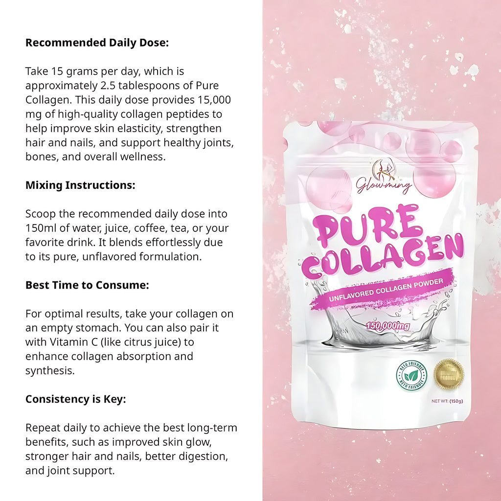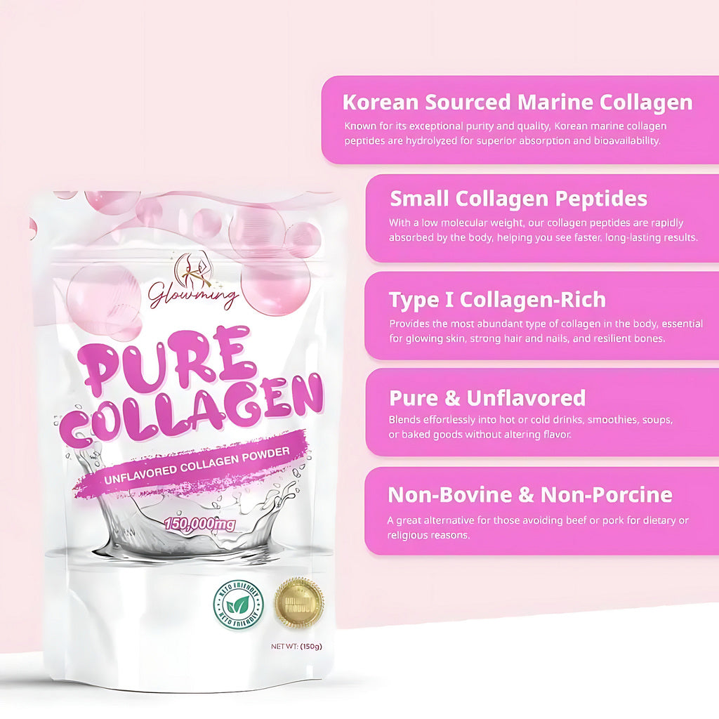 Achieve that natural, glowing radiance from within with Glowming Shape by CC Pure Collagen Unflavored Collagen Powder — a premium marine collagen supplement sourced from Korea. This clean, unflavored formula is specially designed to support your skin, hair, nails, joints, and bones, making it a must-have for everyday wellness and beauty care.Formulated with pure hydrolyzed marine collagen peptides, it delivers superior absorption and visible results. The powder is unflavored, odorless, and keto-friendly, sweetened naturally with Stevia leaves, so you can easily mix it into your favorite drinks or meals without altering the taste.