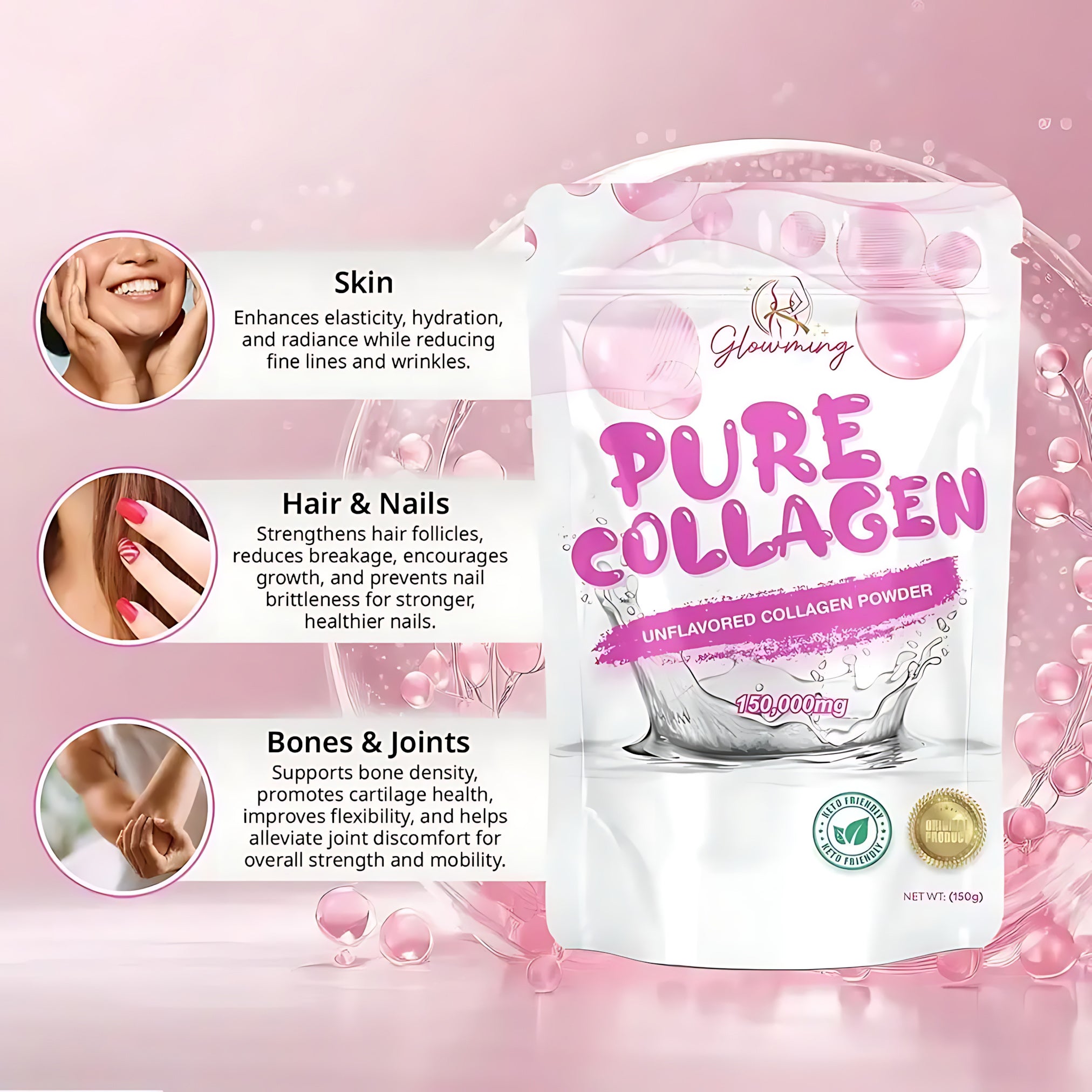 150,000mg Pure Marine Collagen: High-strength formula for maximum beauty and wellness support.