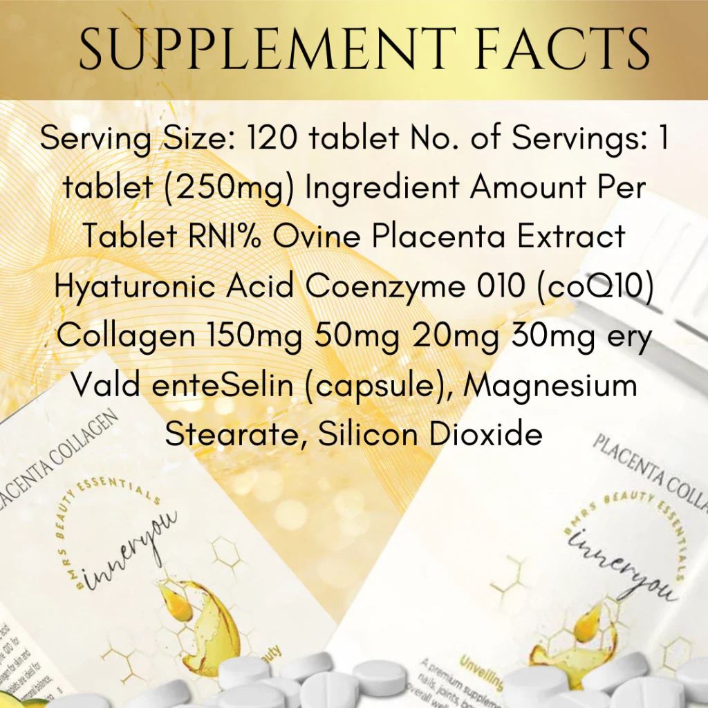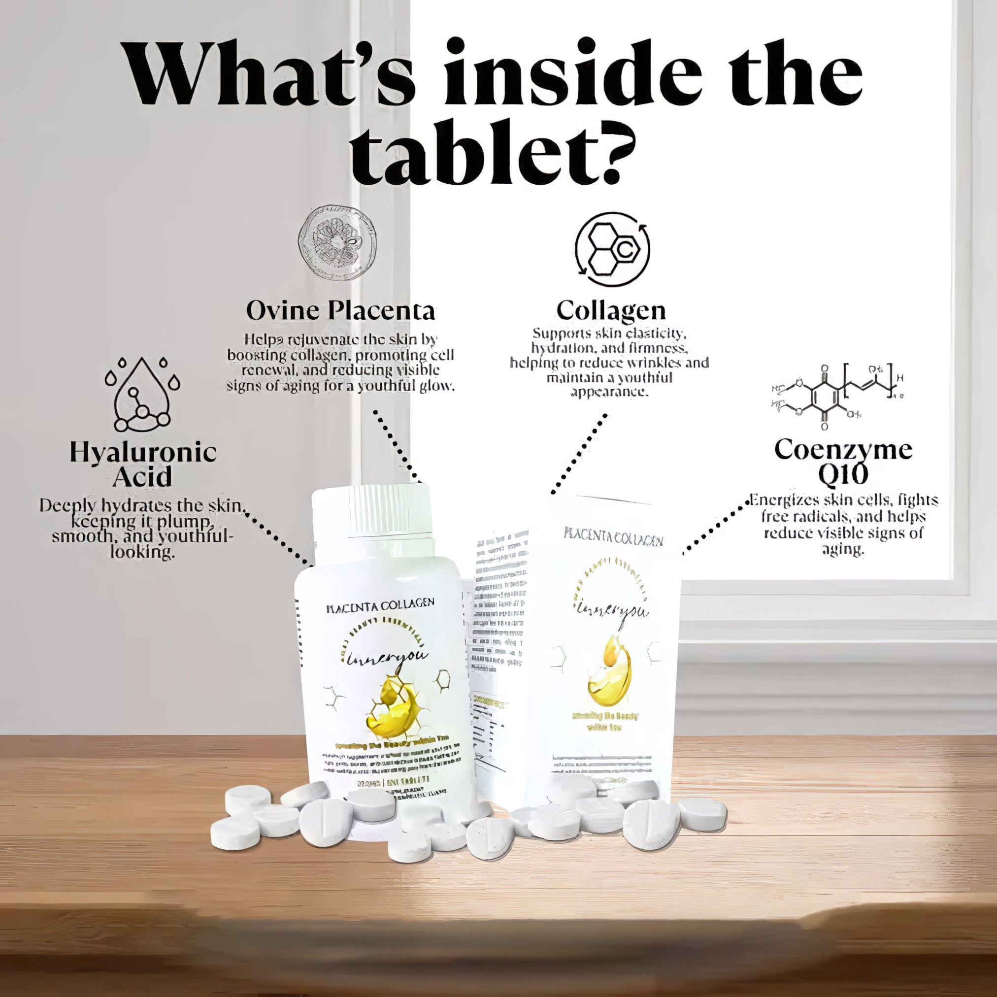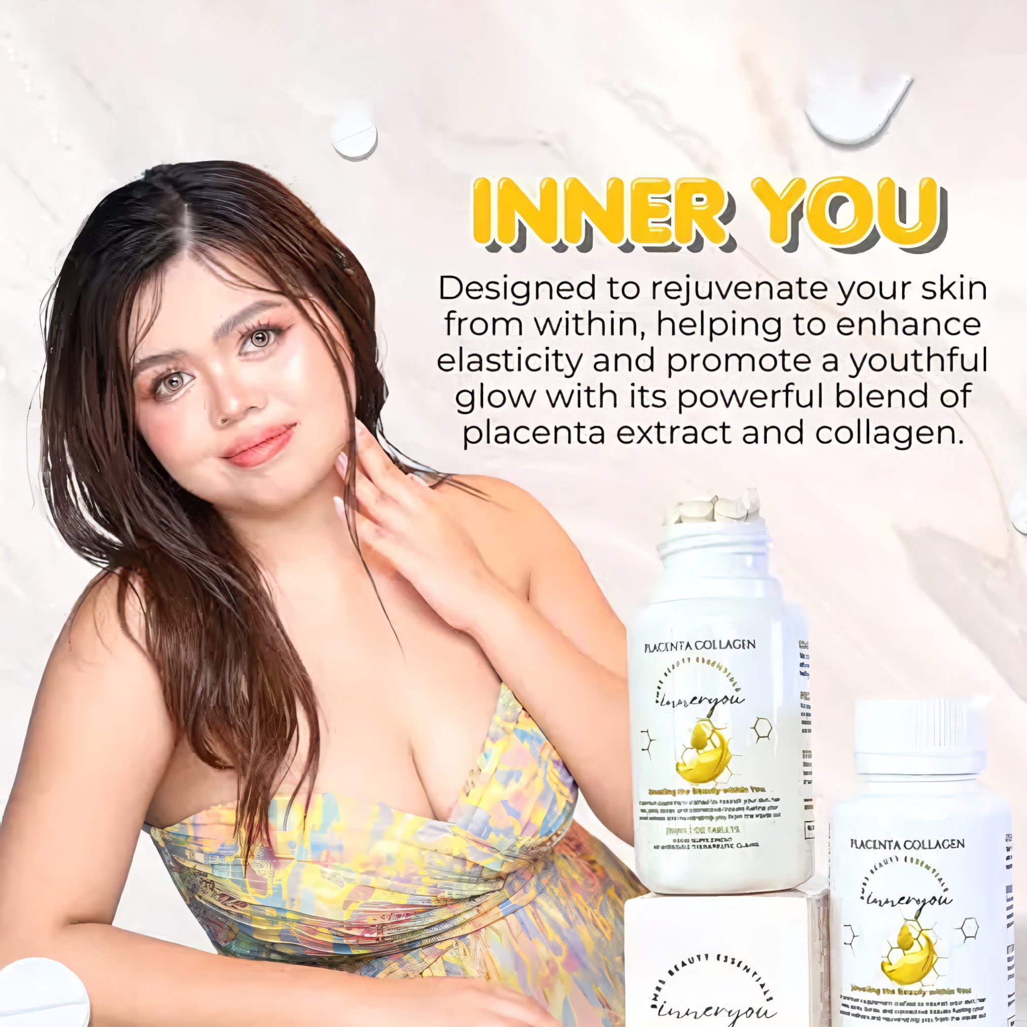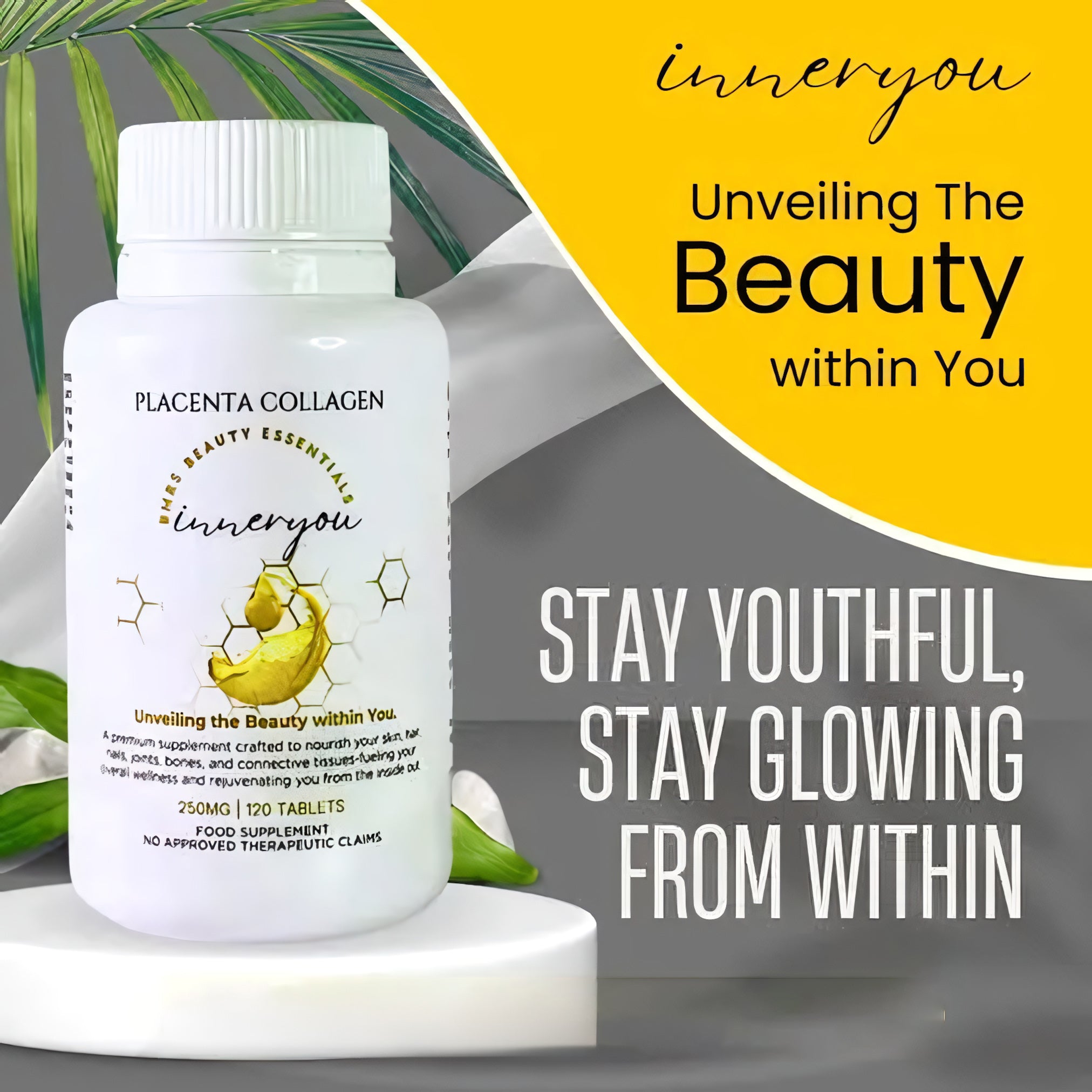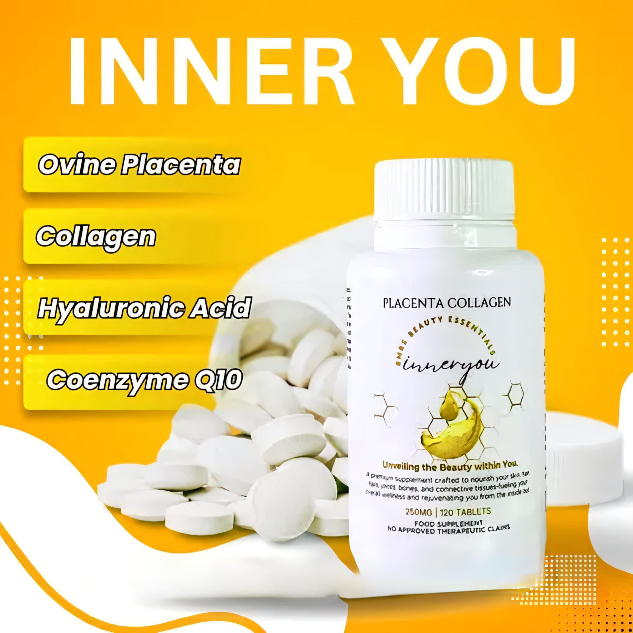 Unlock youthful radiance from within with Inner You Placenta Collagen Beauty Essentials, a premium food supplement designed to support skin renewal, hydration, and overall vitality. Formulated with powerful beauty-enhancing ingredients, each tablet helps nourish your skin, hair, nails, joints, and connective tissues—revealing a healthier, more youthful-looking you.