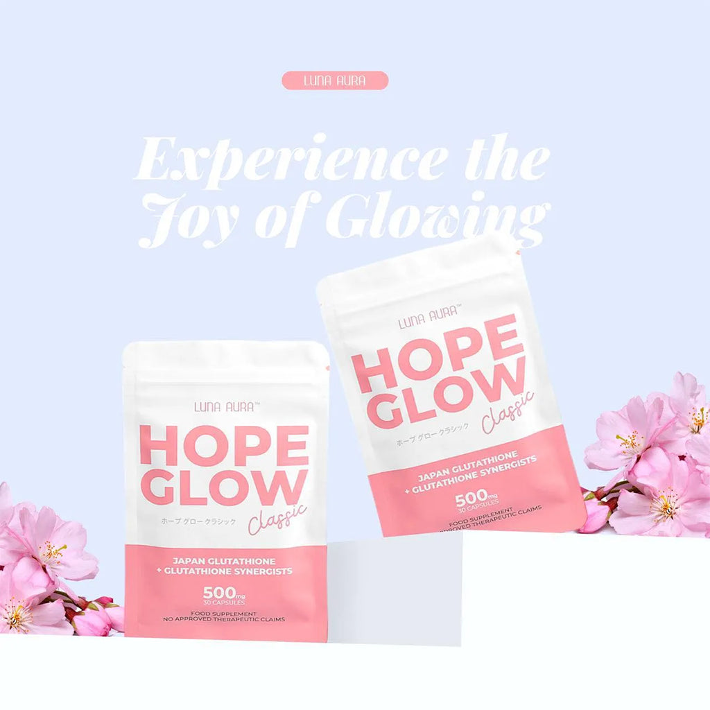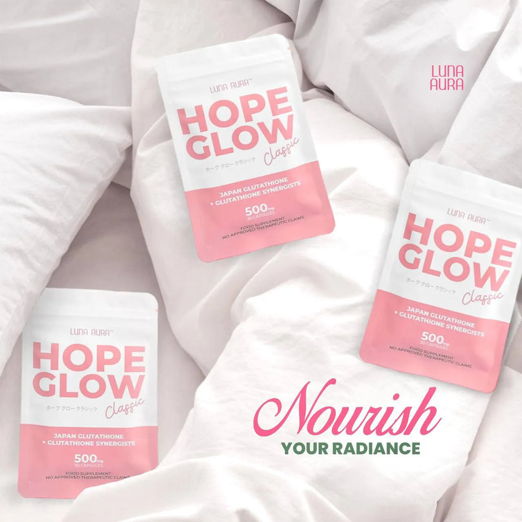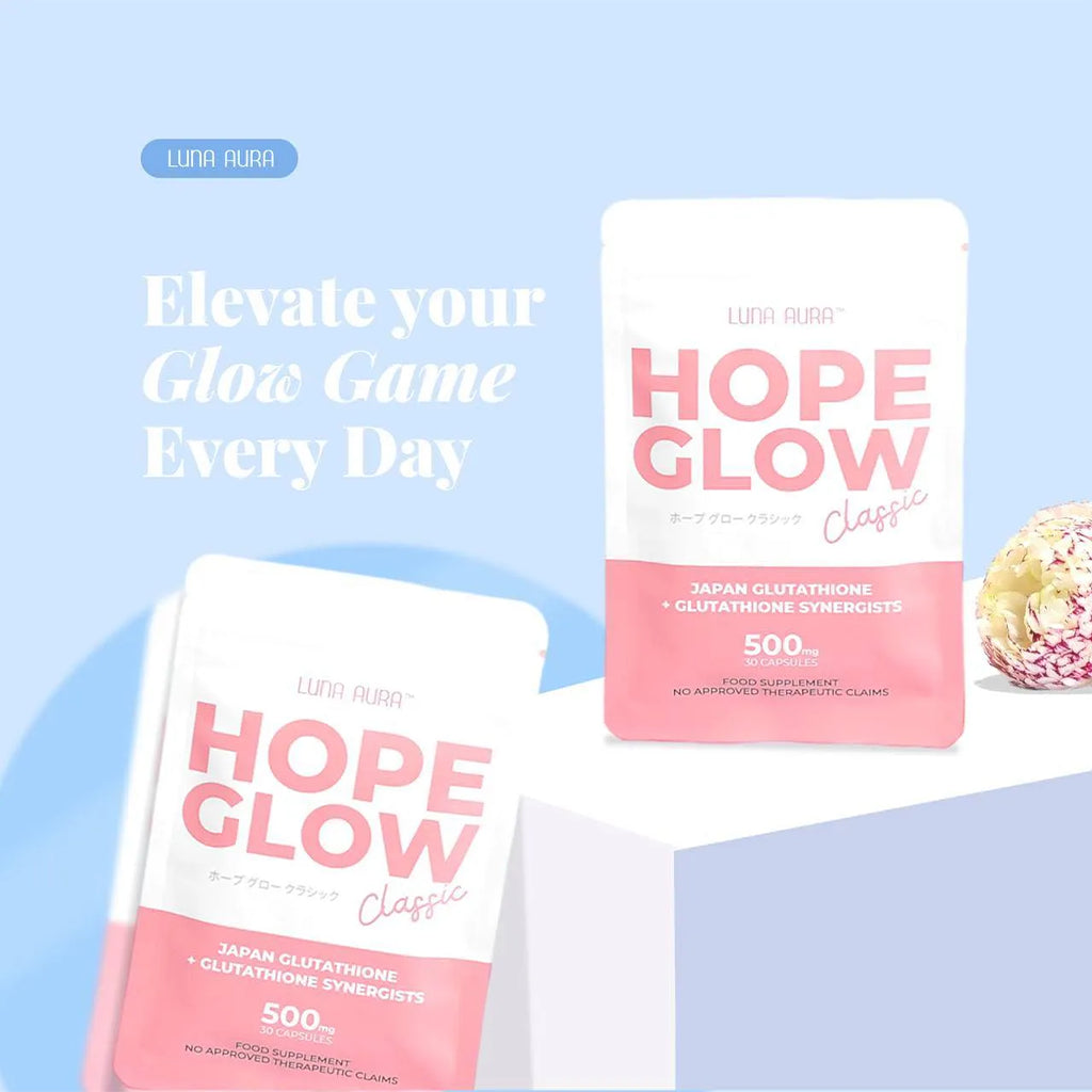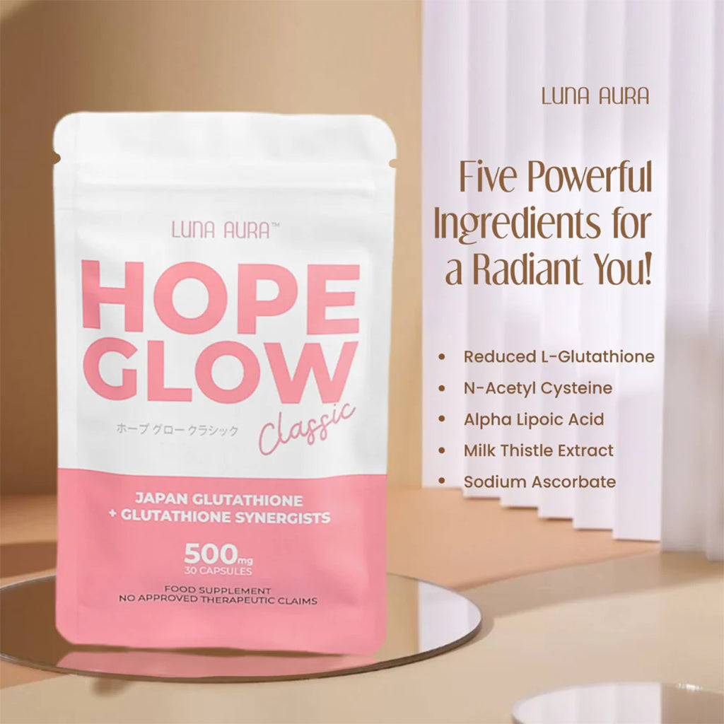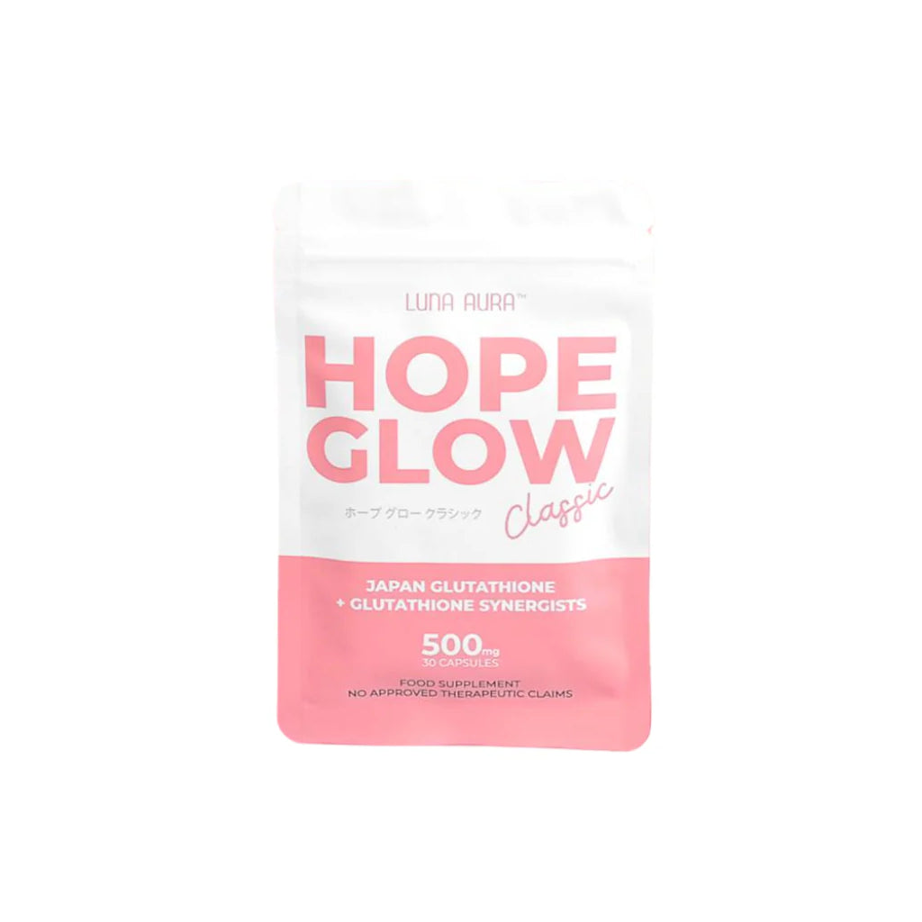 LUNA AURA Hope Glow Classic is a dietary supplement formulated with powerful antioxidants to help support skin health, natural glow, and overall wellness. Designed to work from within, it combines glutathione with other antioxidant ingredients to help promote healthier-looking skin and support the body’s natural defense against free radicals.
