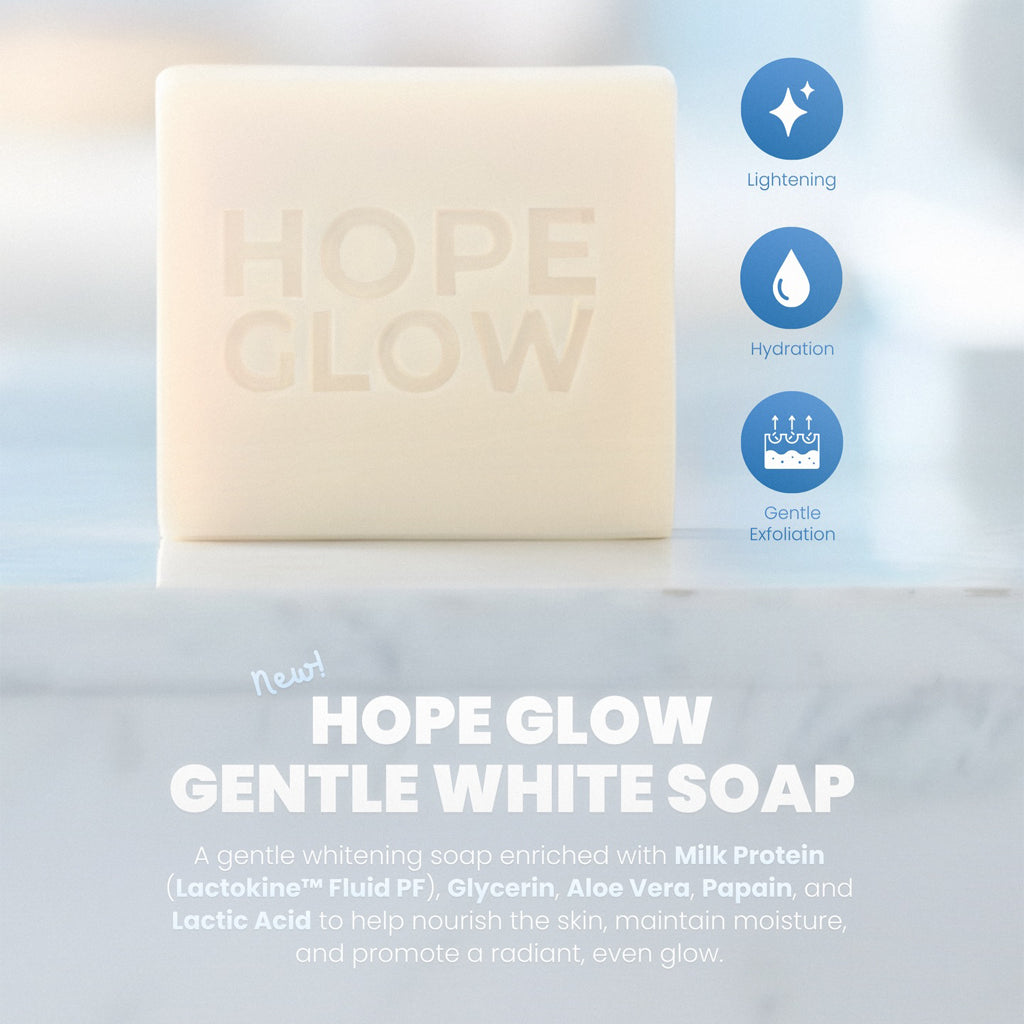 Hope Glow Gentle White Soap is a daily brightening and hydrating cleansing bar designed to help reveal soft, smooth, and healthy-looking skin. Gentle enough for everyday use on both face and body, this soap provides a refreshing cleanse while helping support a naturally radiant glow.
