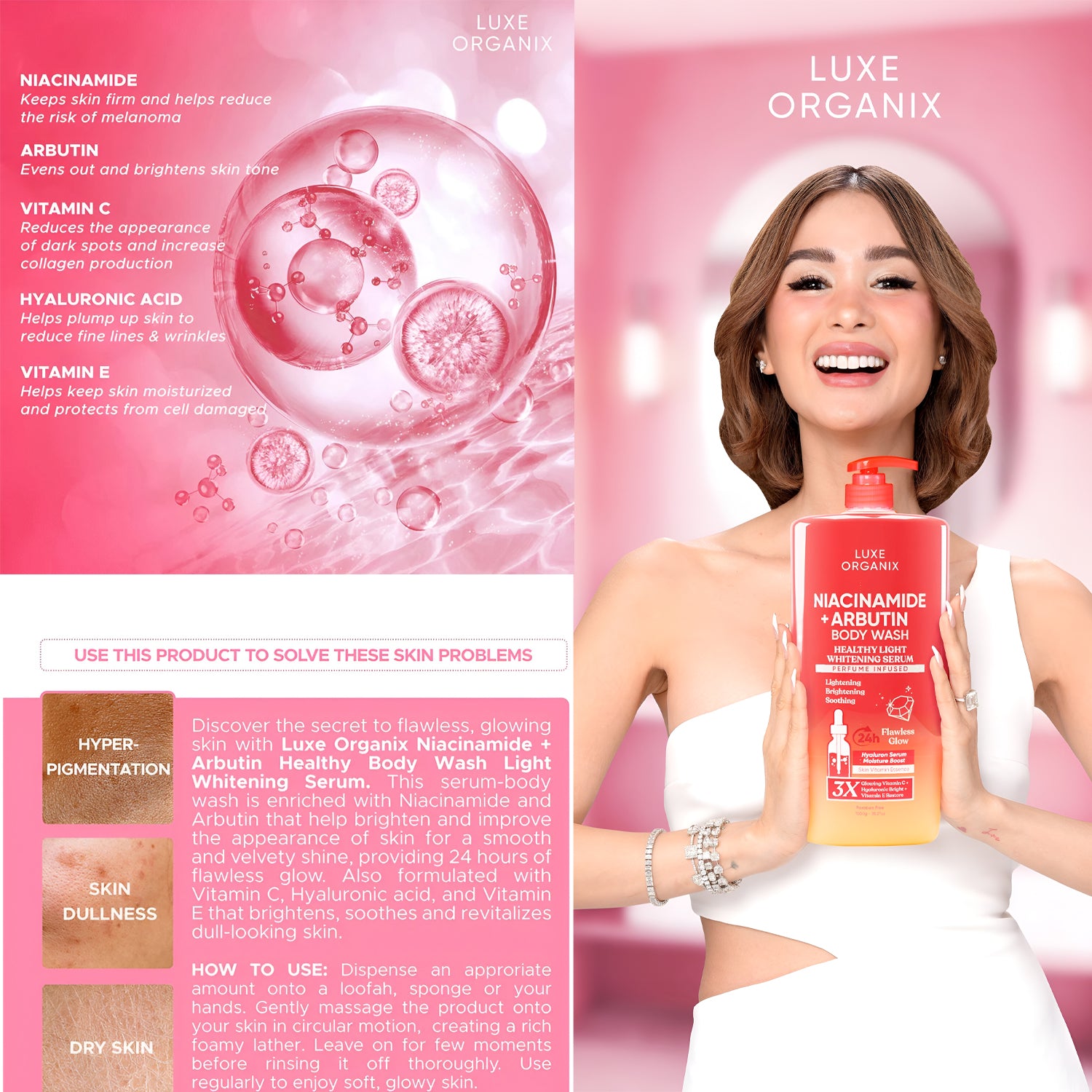 Treat your skin to the Luxe Organix Niacinamide + Arbutin Body Wash and step out with confidence, comfort, and clarity.