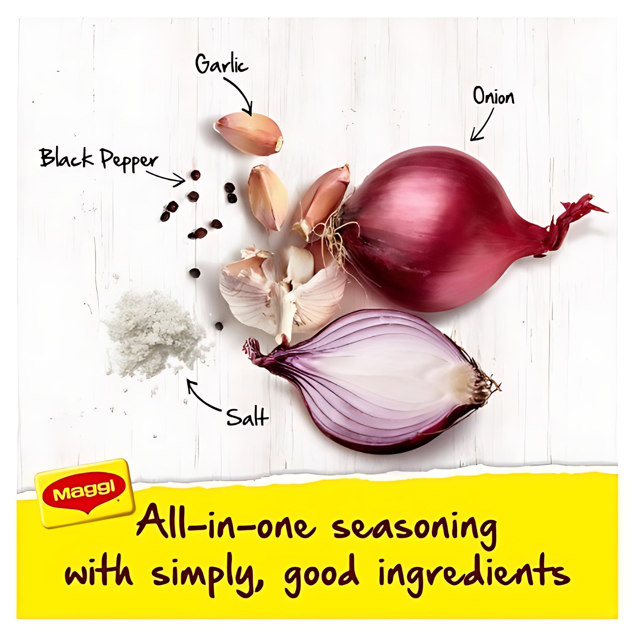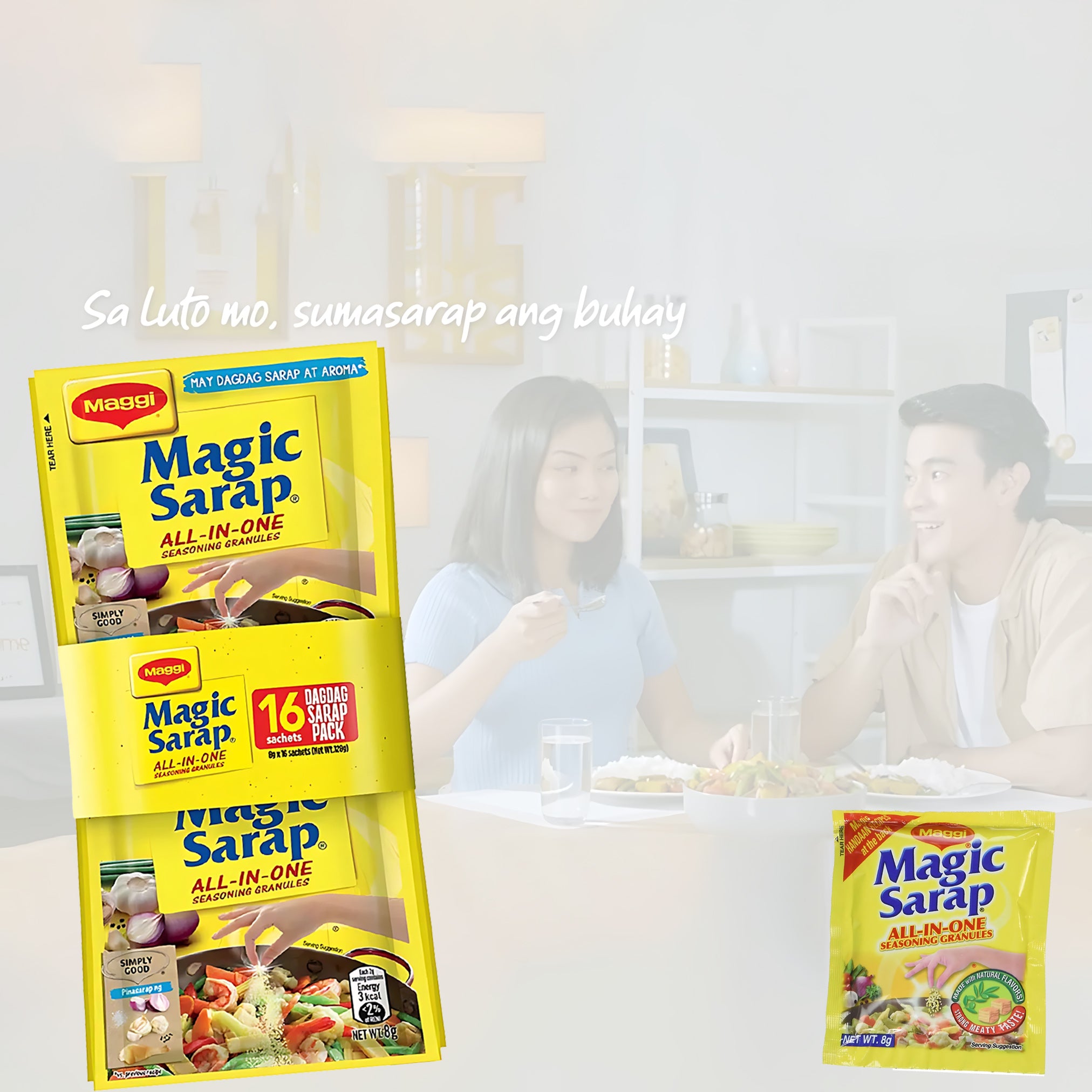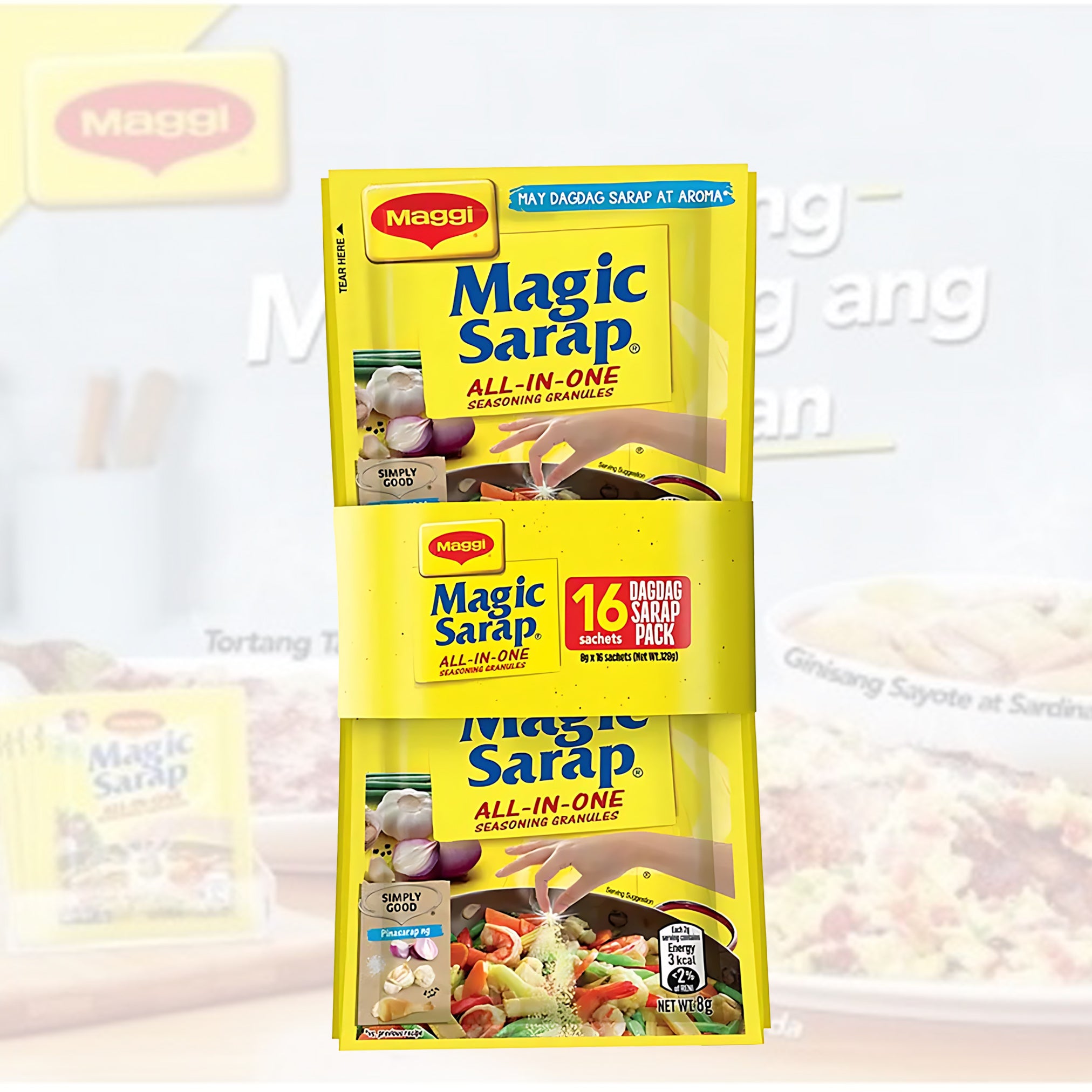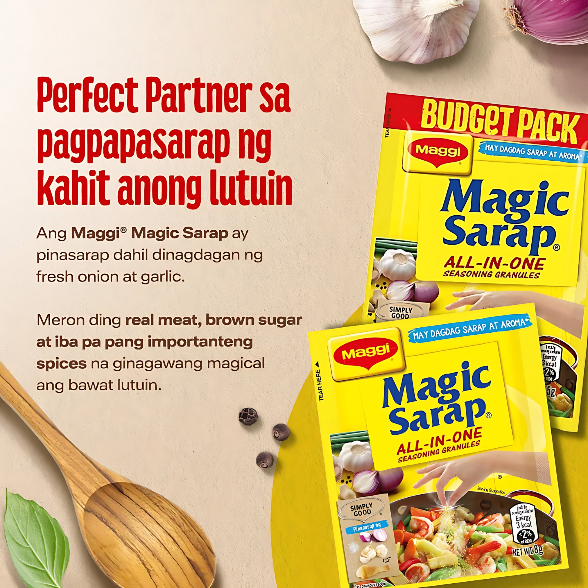 Bring out the best flavor in every dish with Maggi Magic Sarap All-in-One Seasoning Granules. Each 8g sachet is packed with a delicious blend of fresh onion, garlic, real meat, brown sugar, pepper, and spices, giving your everyday meals a balanced, savory taste and rich aroma.