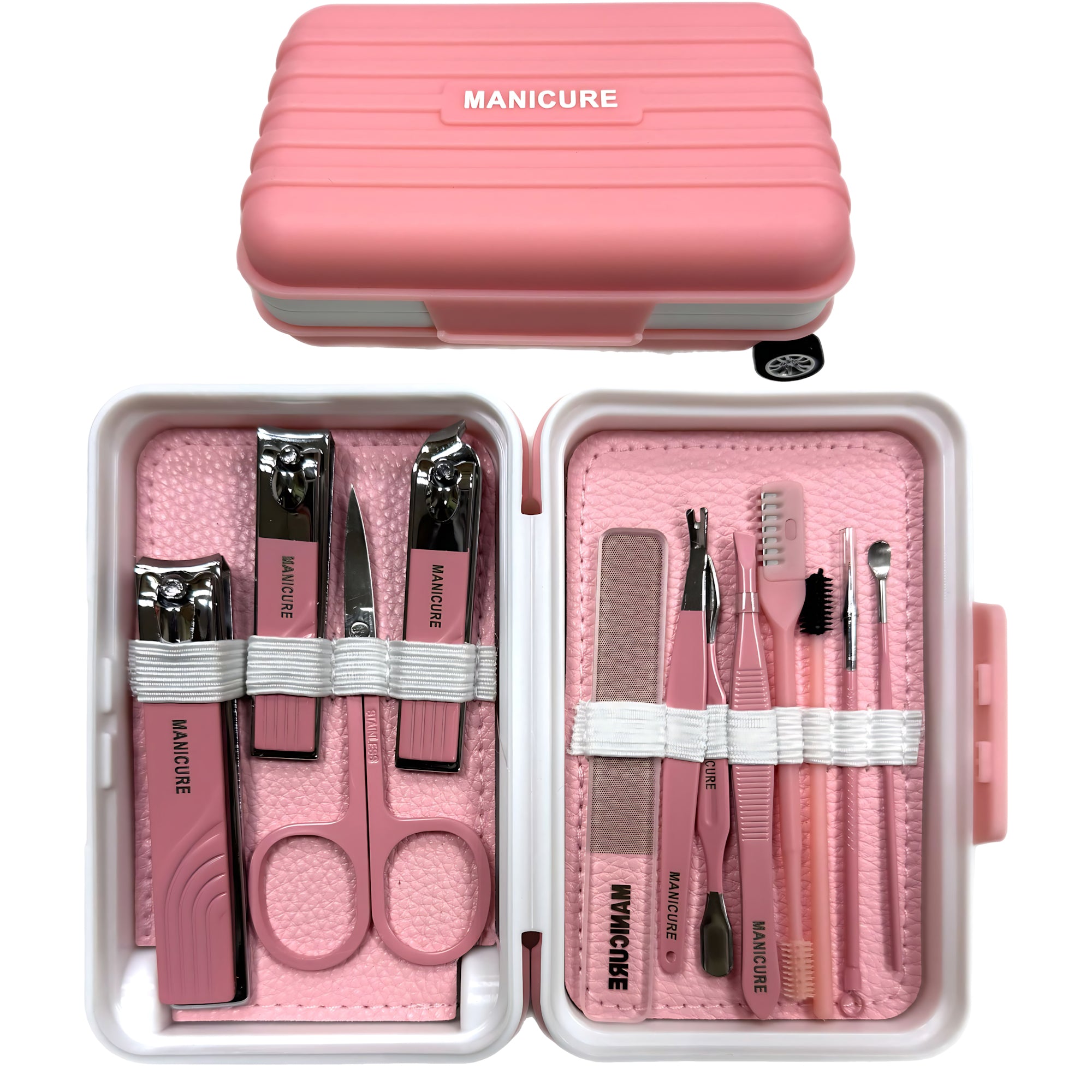 The set comes in a stylish pink PU leather travel case that is lightweight, compact, and easy to carry. With a simple push-button opening, it’s convenient for everyday use at home, on the go, or while traveling.
