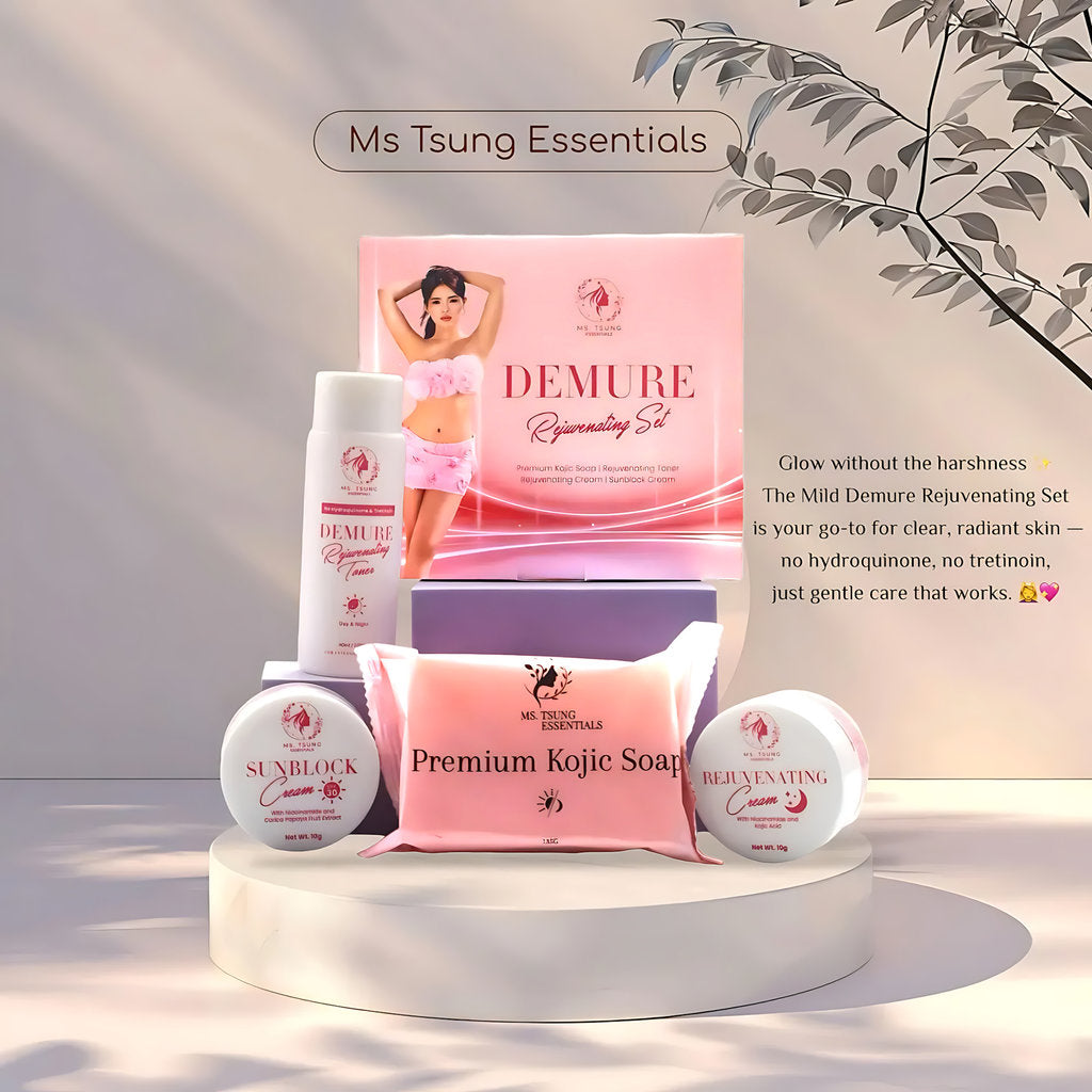 Reveal smoother, clearer, and more radiant skin with the Ms. Tsung Essentials Demure Rejuvenating Set, a complete 4-step skincare system designed to gently renew, brighten, and protect your skin. Formulated with mild yet effective ingredients, this set helps reduce blemishes, dark spots, and dullness while keeping your skin healthy and glowing.