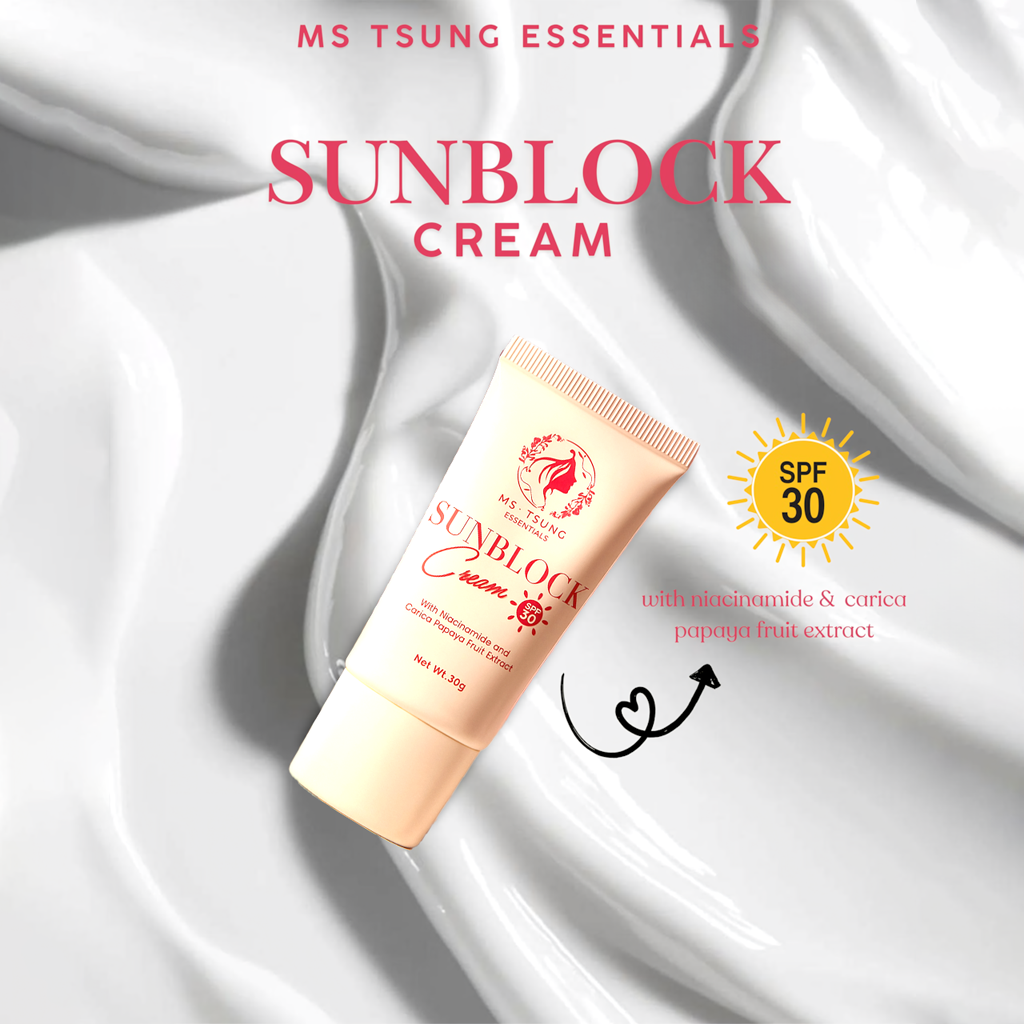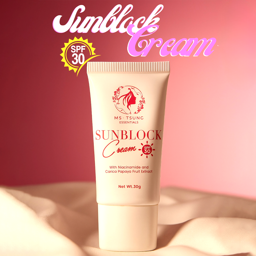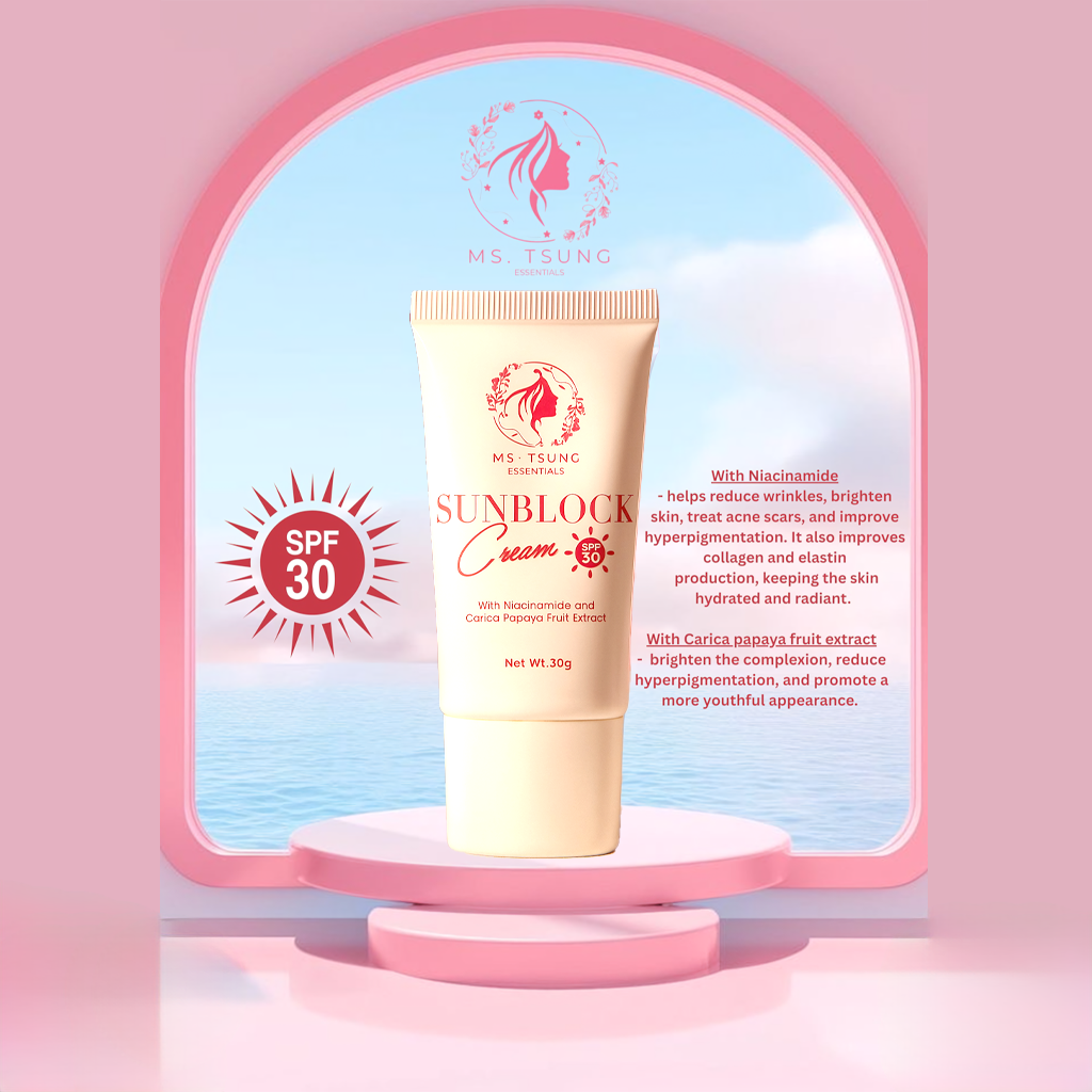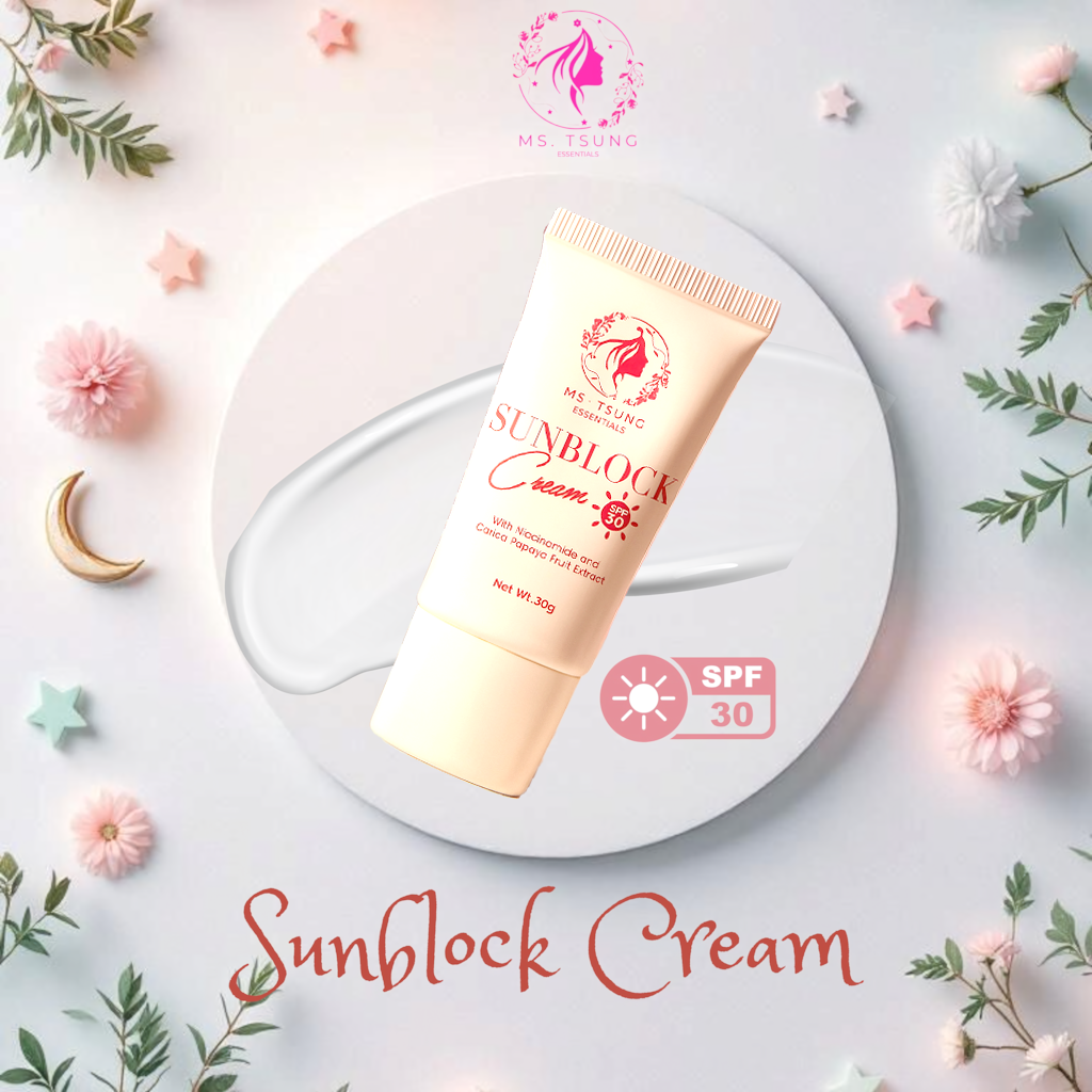 Keep your skin glowing and shielded with Ms. Tsung Sunblock Cream SPF 30, formulated with Niacinamide and Carica Papaya Fruit Extract for daily sun protection and skin nourishment. This lightweight, non-sticky cream protects your skin from harsh UV rays while helping brighten, even out skin tone, and keep your complexion looking naturally fresh.