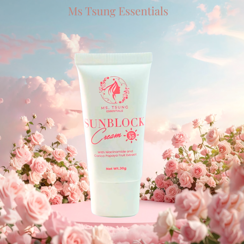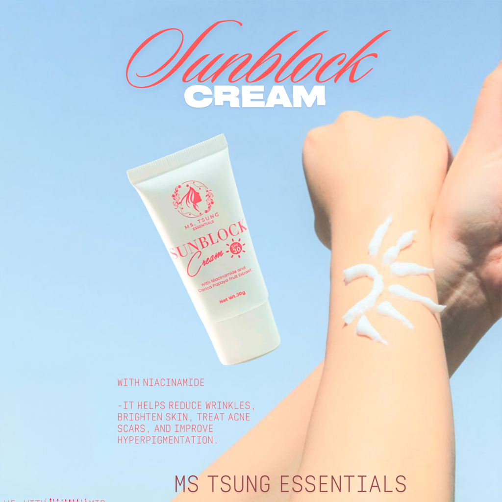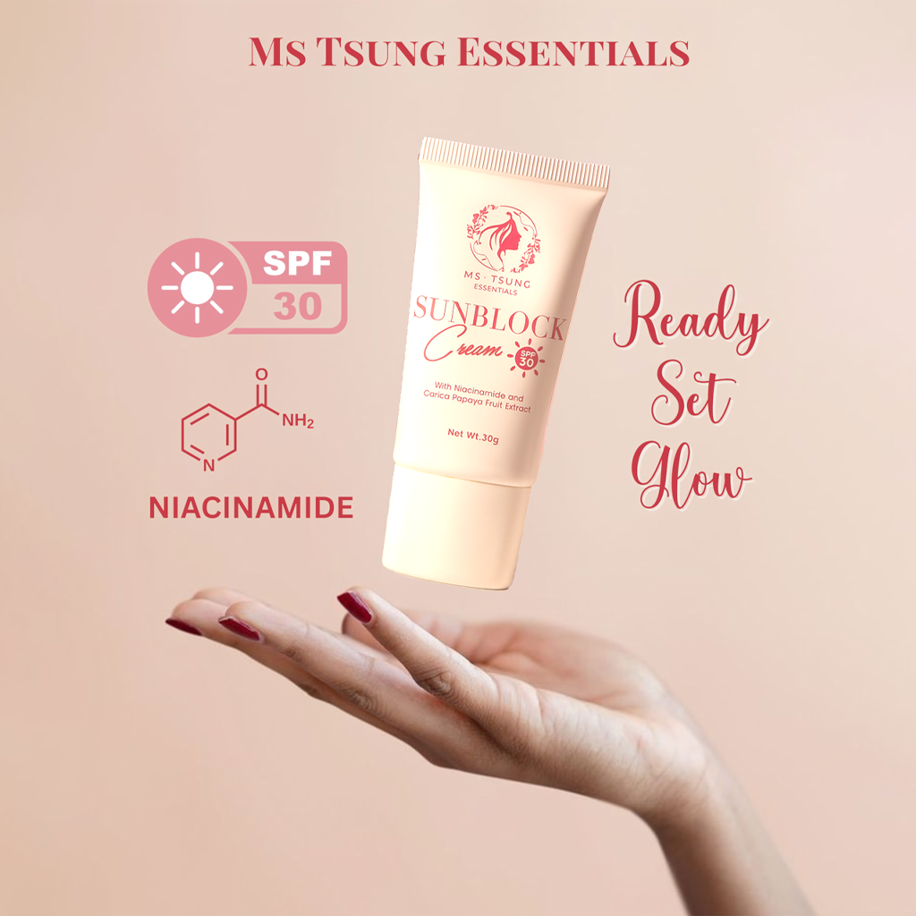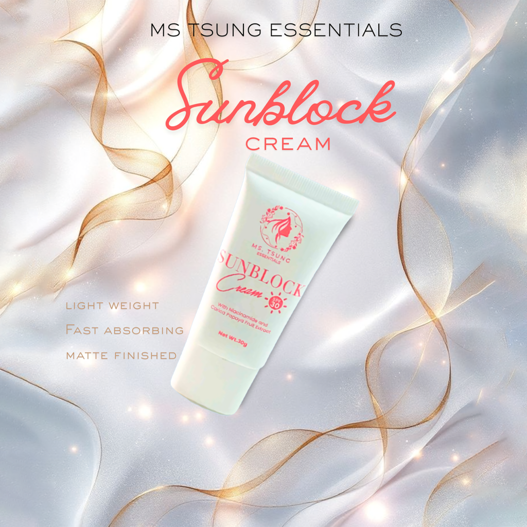 Keep your skin glowing and shielded with Ms. Tsung Sunblock Cream SPF 30, formulated with Niacinamide and Carica Papaya Fruit Extract for daily sun protection and skin nourishment. This lightweight, non-sticky cream protects your skin from harsh UV rays while helping brighten, even out skin tone, and keep your complexion looking naturally fresh.