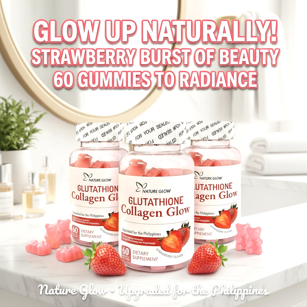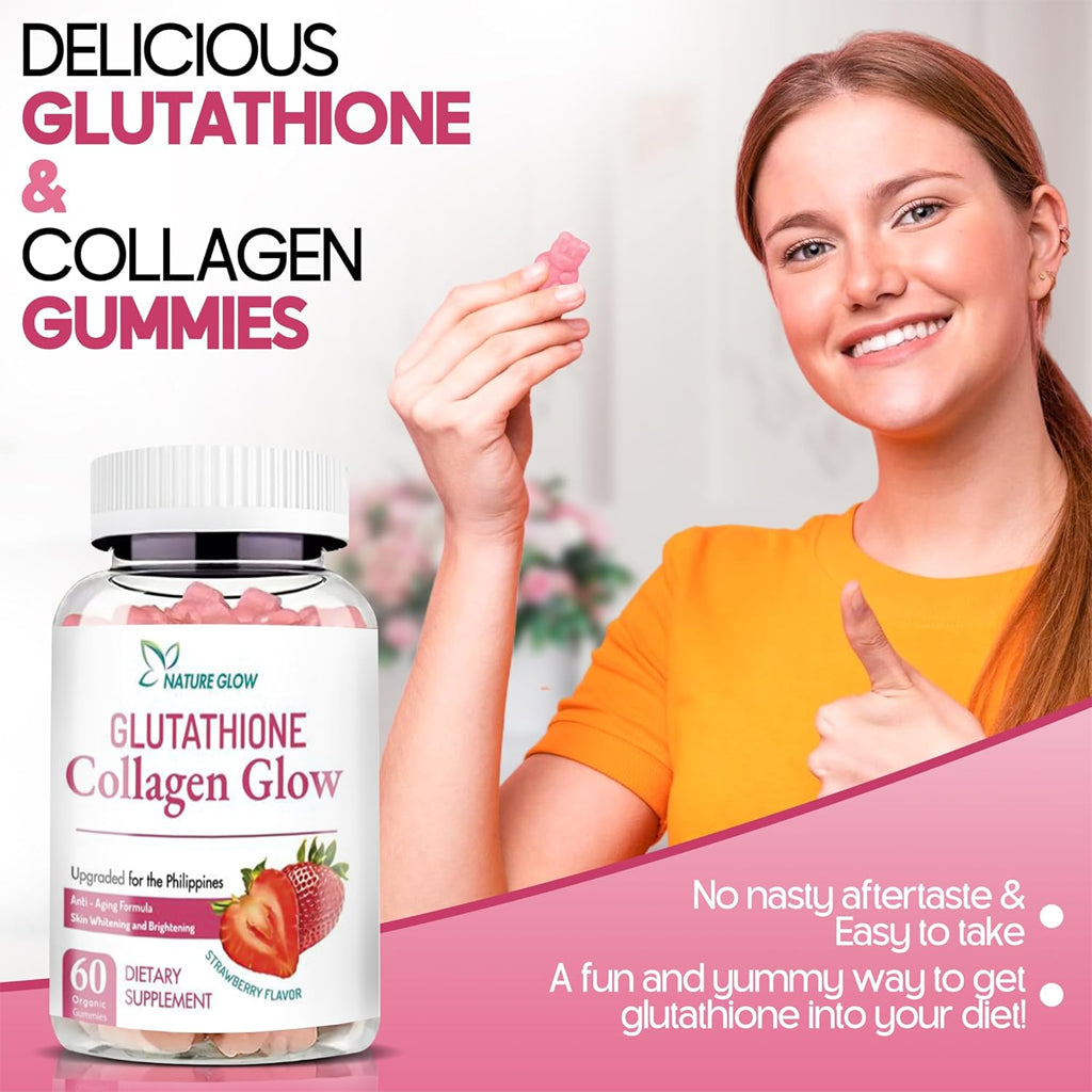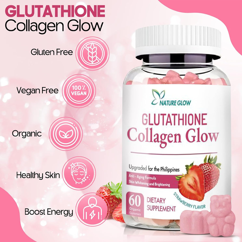 Enjoy youthful, glowing, and healthier skin from within with Nature Glow Glutathione Collagen Glow Strawberry Gummies.