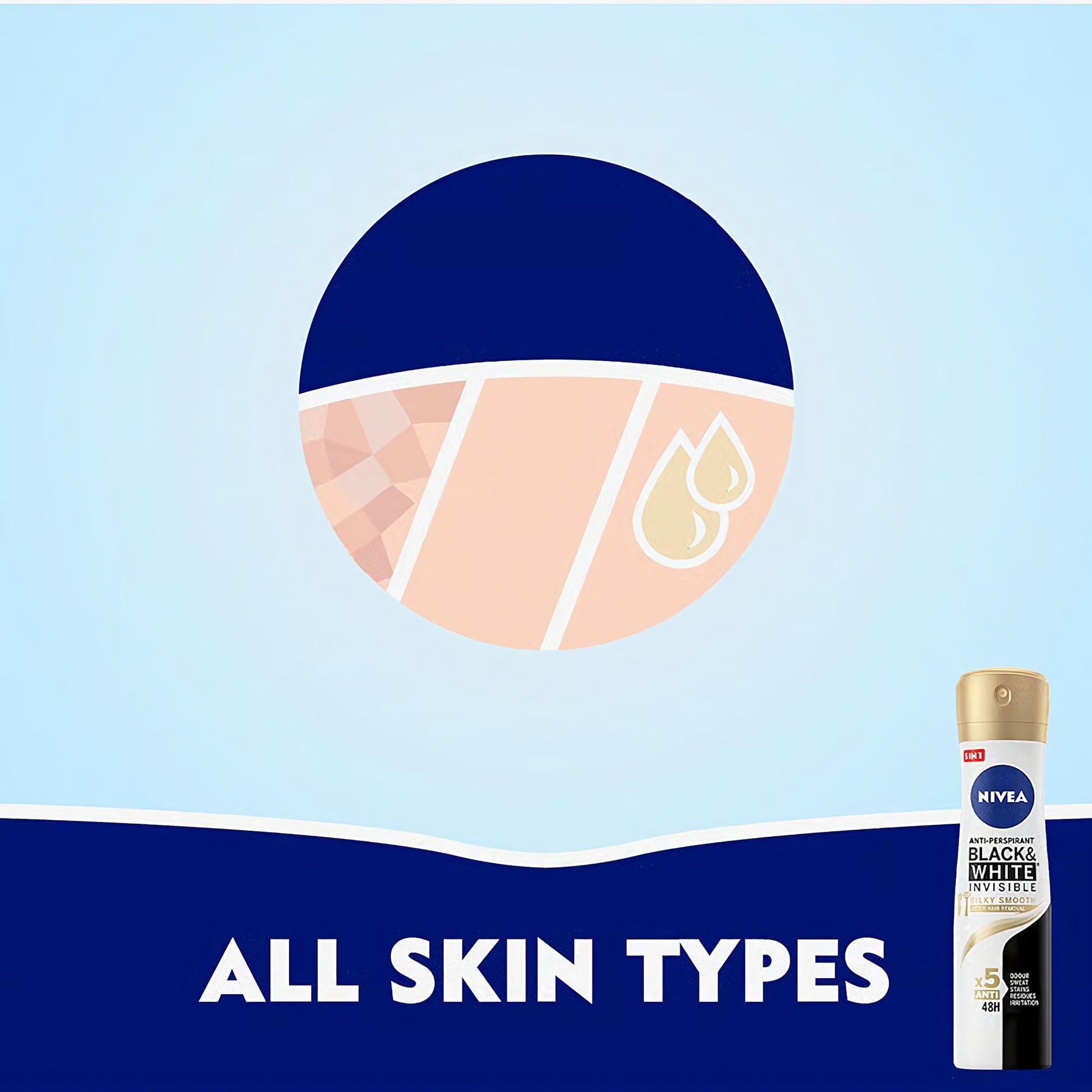Stay confidently fresh all day with NIVEA Black & White Invisible Silky Smooth Anti-Perspirant Spray. Specially designed to protect both your skin and your clothes, this advanced formula offers 48-hour sweat and odor protection while preventing white marks on black fabrics and yellow stains on white clothes.