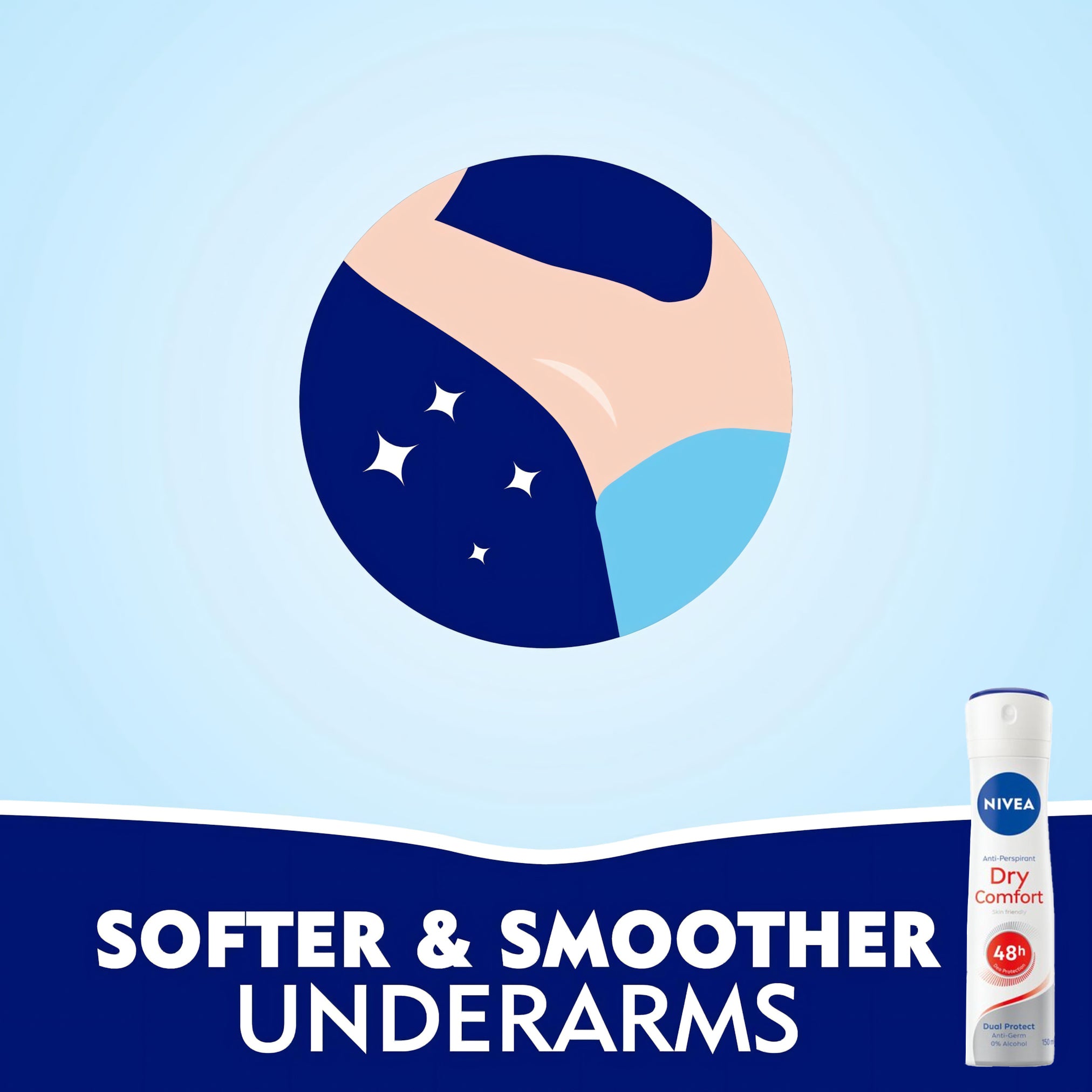 Stay confidently fresh all day with NIVEA Dry Comfort Anti-Perspirant Spray, formulated to give long-lasting dryness and odor protection. Powered by the DryPlus System, this anti-perspirant delivers effective sweat regulation while keeping underarms smooth and comfortable.