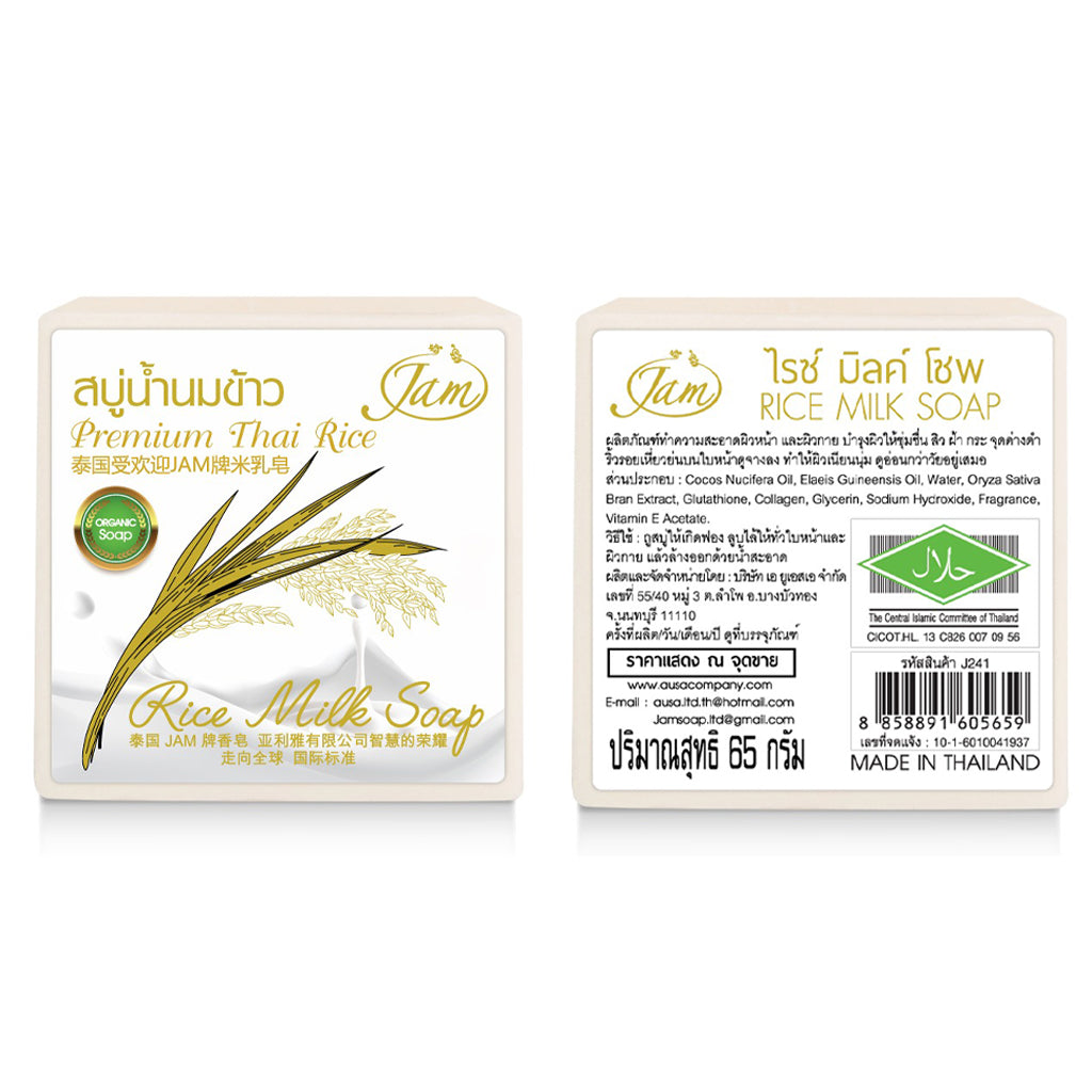 Jam Rice Milk Soap is a gentle facial and body cleansing product formulated to moisturize the skin while helping to reduce acne, freckles, dark spots, and fine lines. Enriched with natural rice bran extract, glutathione, collagen, and vitamin E, this soap works to make the skin look smoother, softer, and more youthful with regular use.