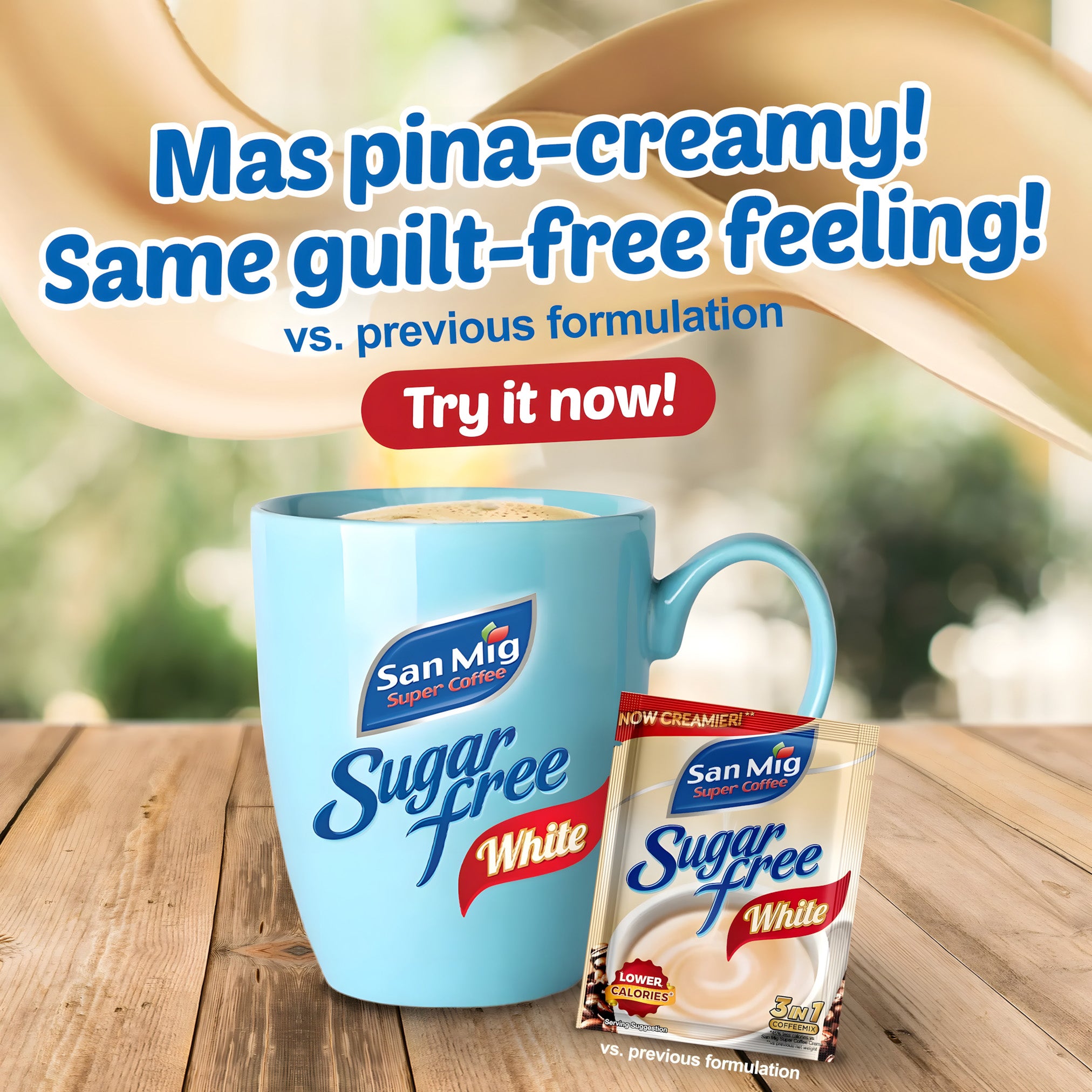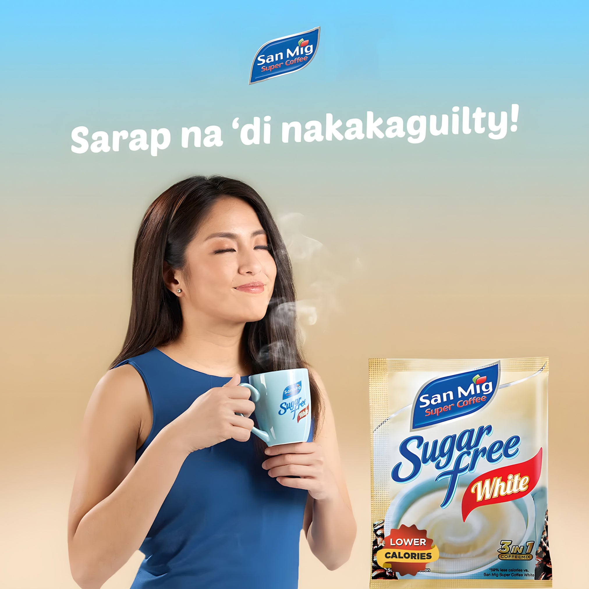San Mig Super Coffee Sugar-Free White 3-in-1 — the same delicious coffee goodness, now without the guilt.
