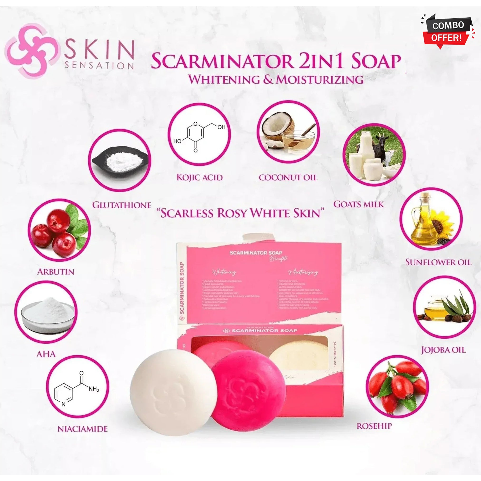 Reveal smoother, clearer, and more radiant skin with Skin Sensation Scarminator 2-in-1 Soap, a powerful dual-action formula that whitens and moisturizes while helping fade scars, acne marks, and pigmentation. Specially crafted for all skin types, this gentle yet effective soap cleanses deeply, nourishes the skin, and restores its natural glow.