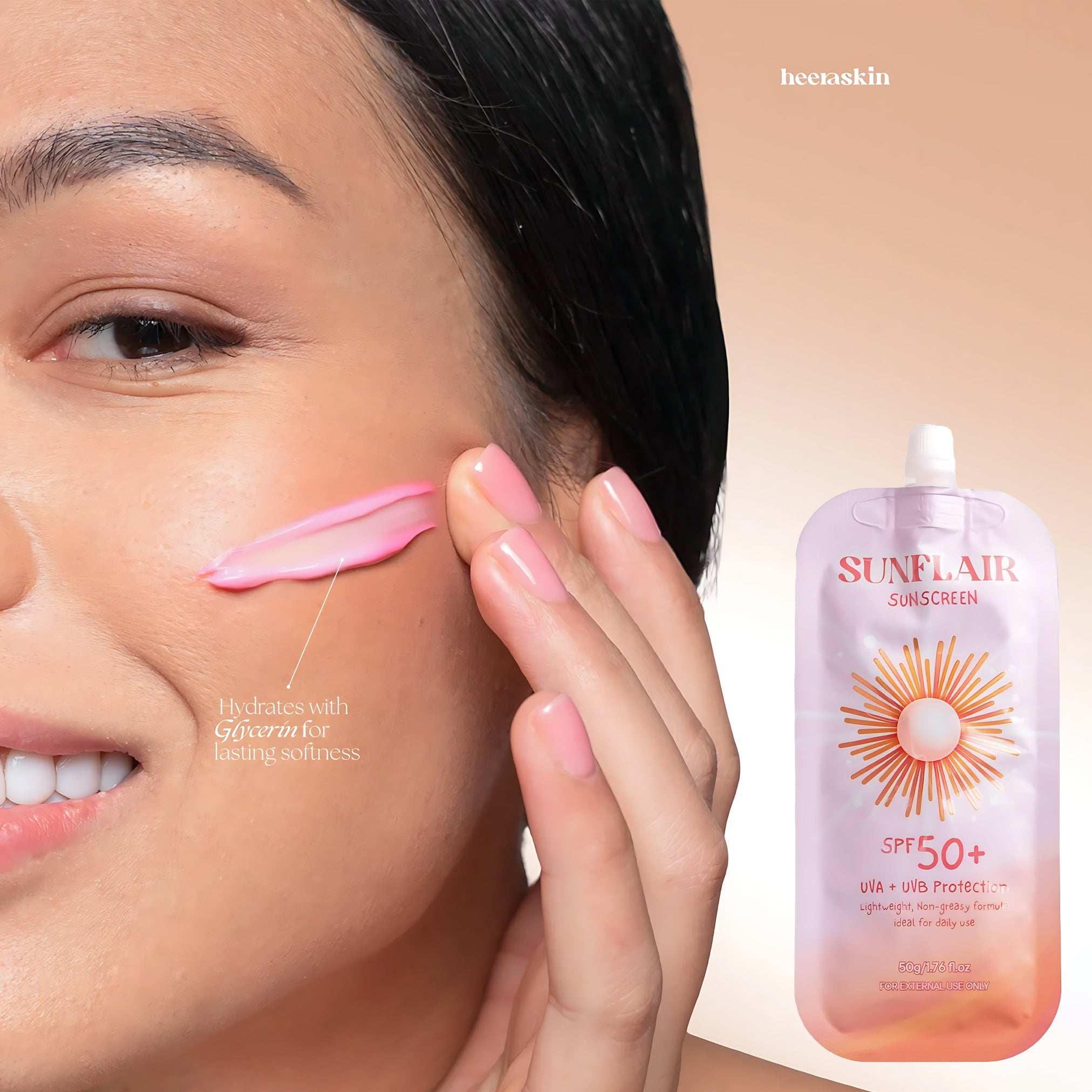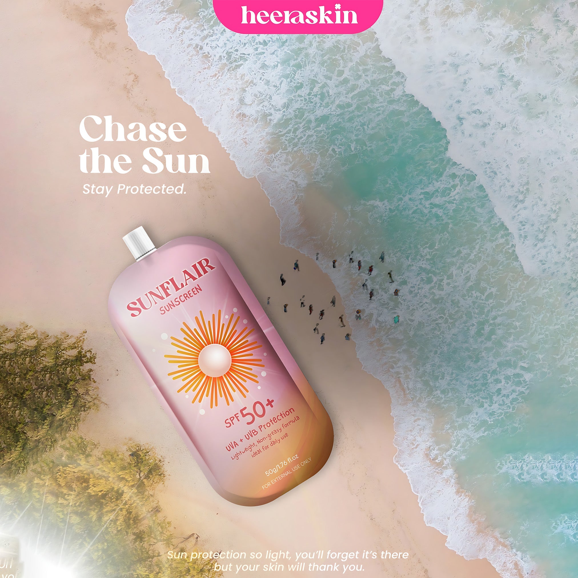 Meet Sunflair, the lightweight sunscreen that melts into your skin for breathable, everyday sun defense—without the greasy feel. With SPF 50 to shield you from UVA & UVB rays and skin-soothing actives to keep your complexion calm, even, and radiant, Sunflair helps you glow confidently rain or shine.