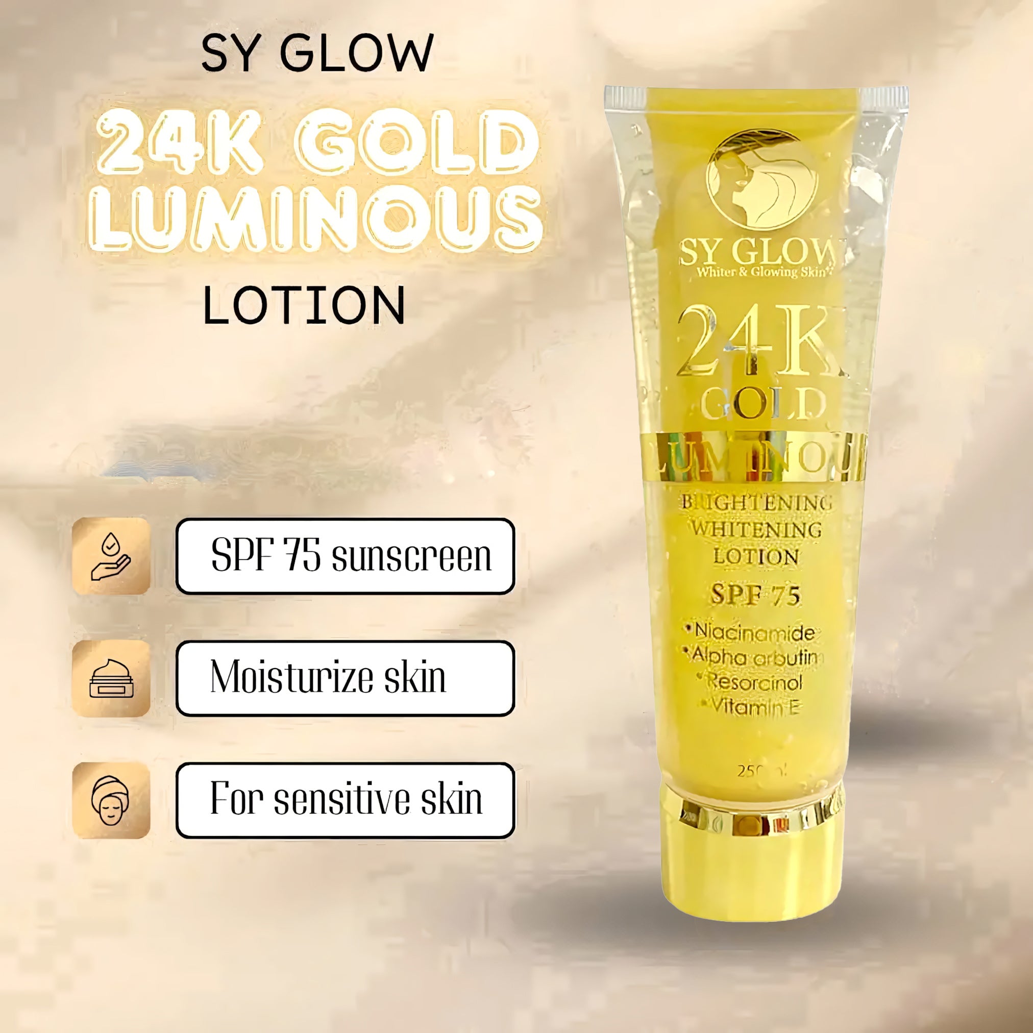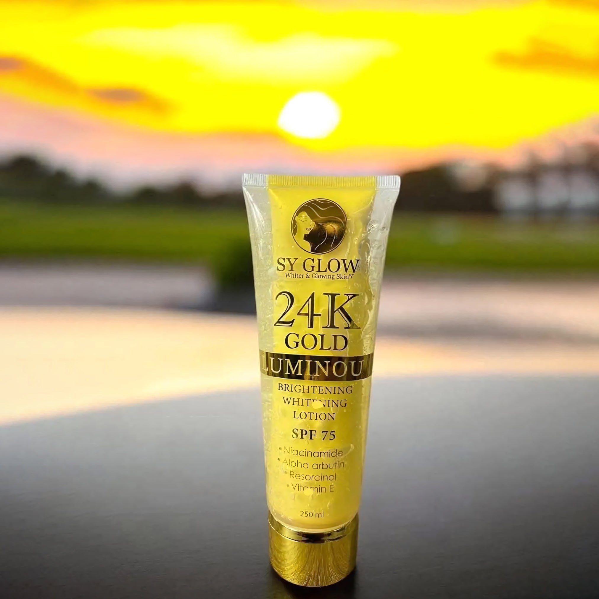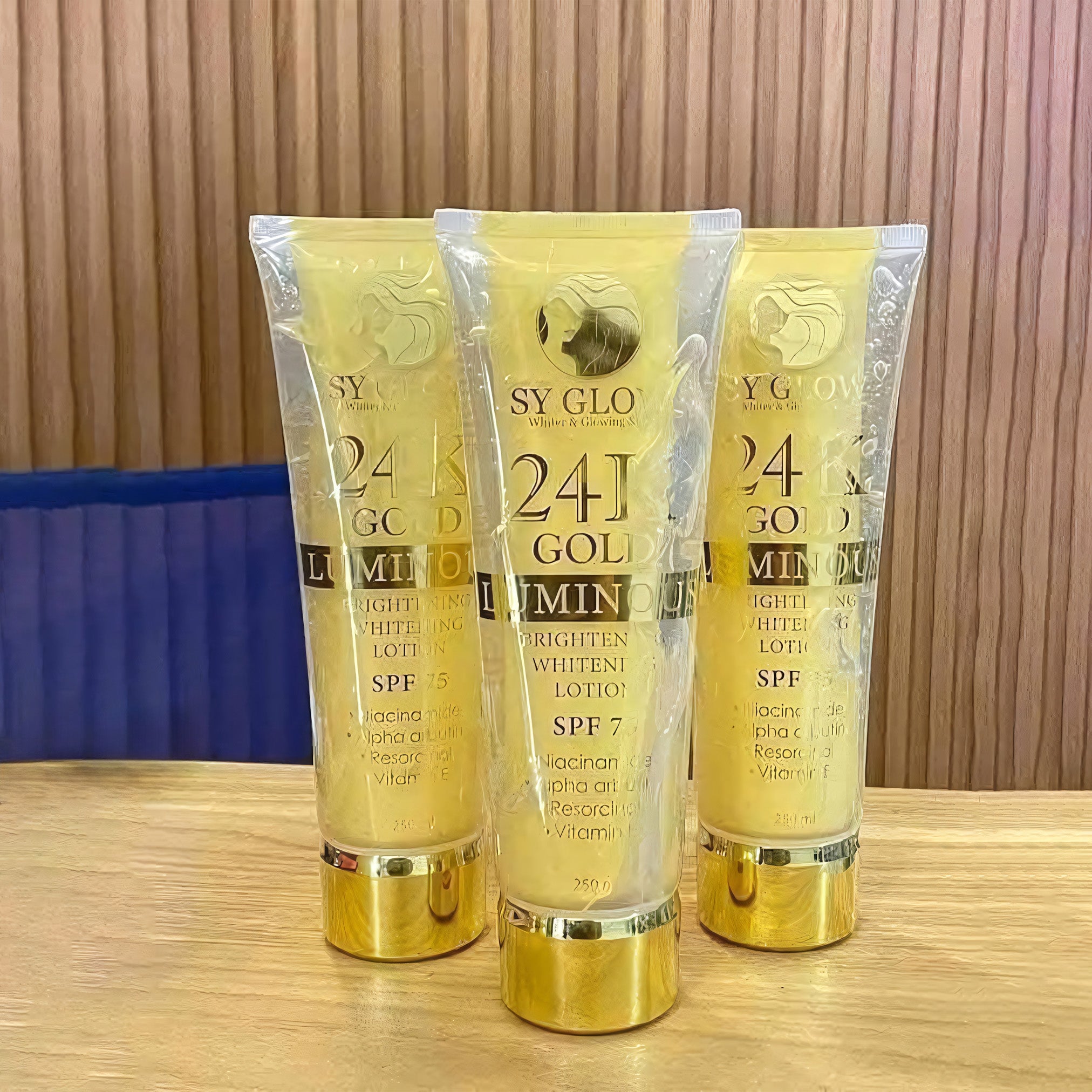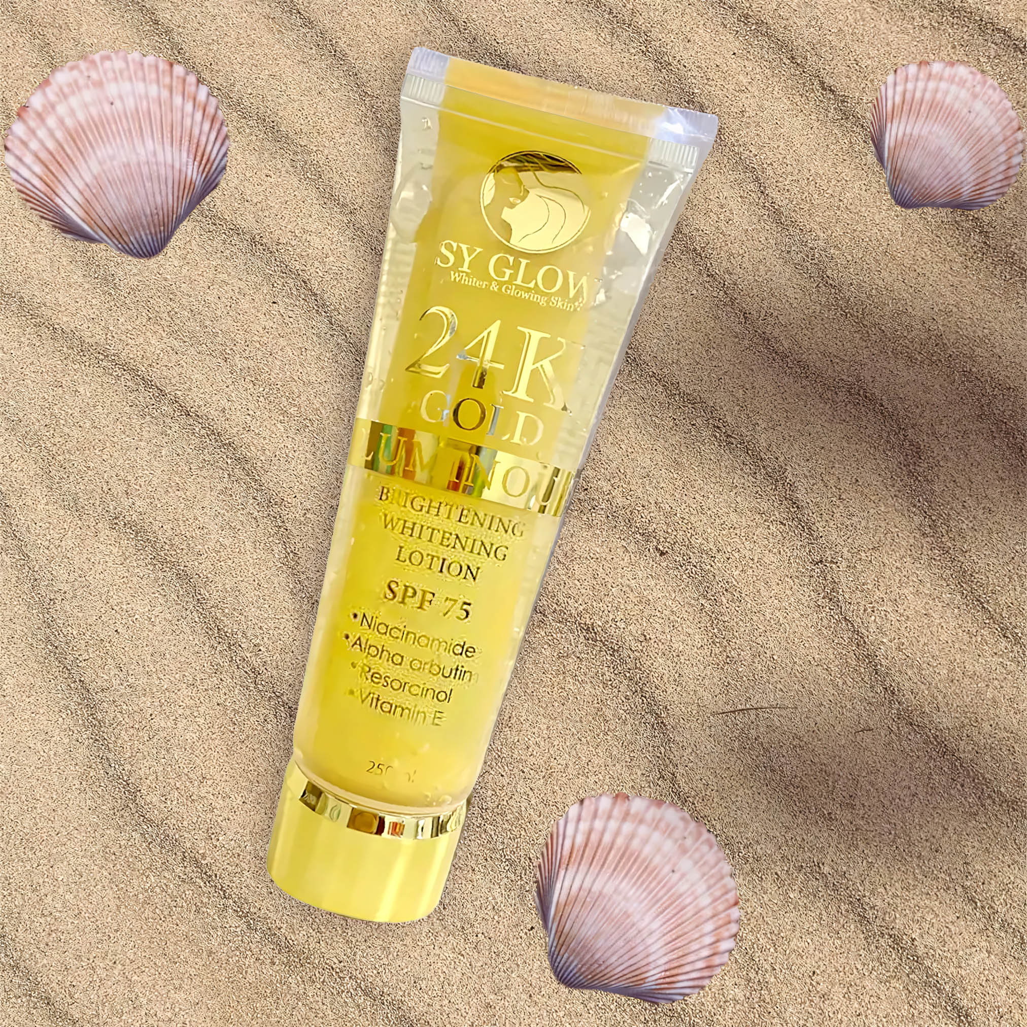 Experience luxurious skincare with SY Glow 24K Gold Luminous Lotion SPF 75, a powerful brightening and anti-aging body lotion designed to give your skin a radiant, even-toned glow. Infused with 24K Gold, Niacinamide, Alpha Arbutin, and Vitamin E, this lotion helps lighten dark spots, smoothen skin texture, and protect your skin from sun damage—all in one lightweight formula.